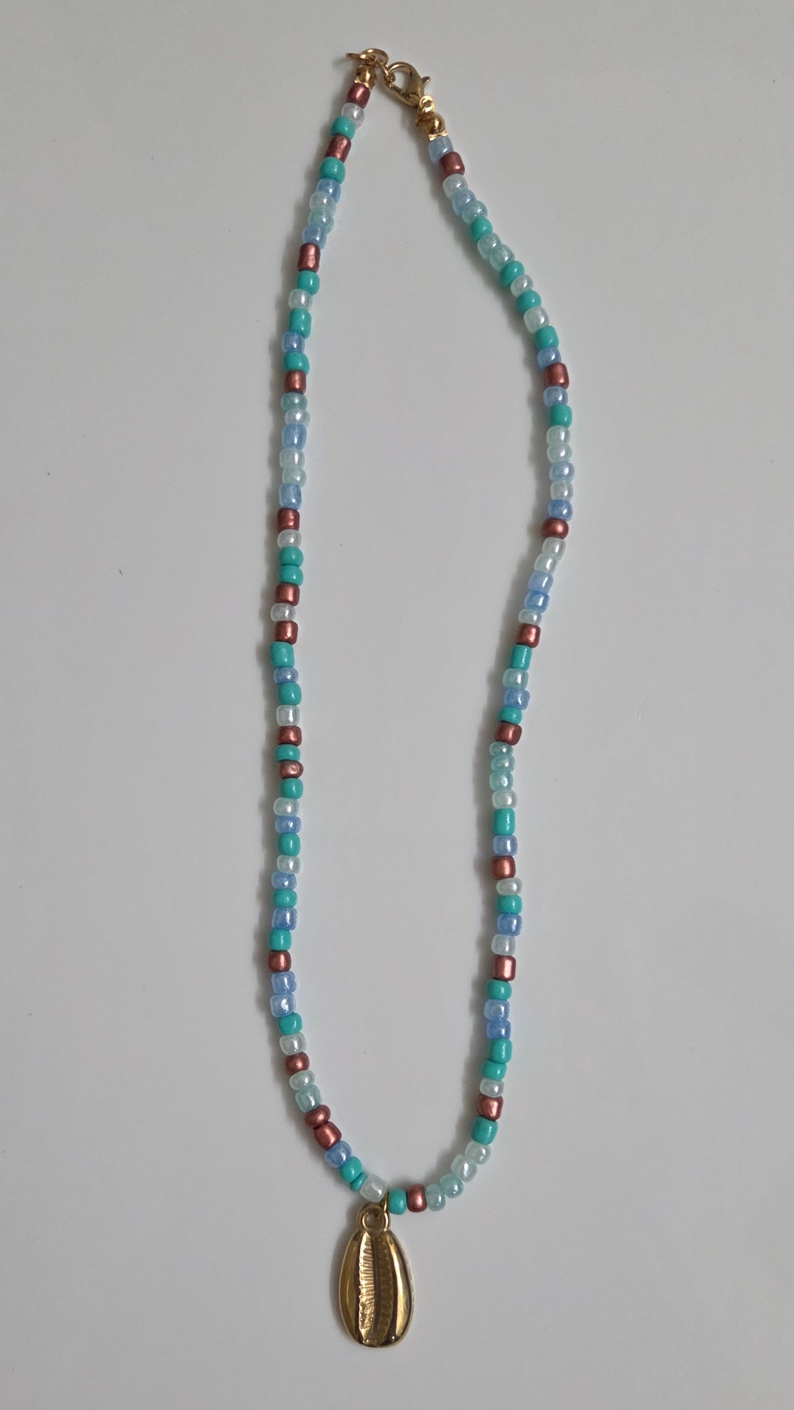 This handcrafted beaded necklace features a vibrant mix of sea-toned glass beads. At the center hangs a sleek gold cowrie shell charm.